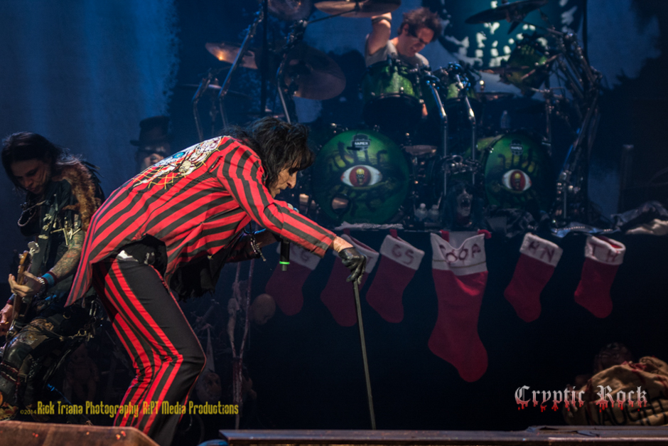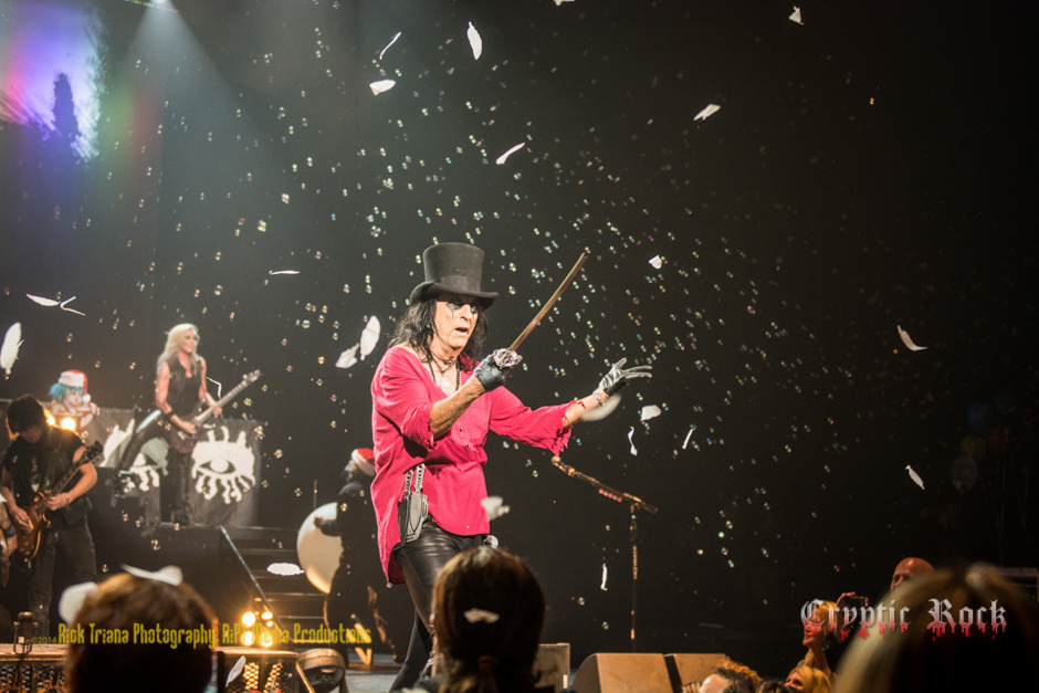 After one final intermission, a quick set change, and the lights dimmed for the evening’s much anticipated headliner. With bits of “Welcome to My Nightmare” and classic “Steven'”setting the tone, Cooper appeared through a shower of sparklers that seemed to be raining down from the sky. He wore his traditional red-and-black striped suit to welcome the fans to his Christmas nightmare with “Hello, Hooray.” The stage was an absolutely amazing vision, complete with a Santa bag marked “naughty,” Christmas stockings hung by the drum set with care, and of course all of the Horror masks and props that usually accompany Cooper’s theatrical sets. He and his talented band rocked on through some of his timeless hits including “No More Mr. Nice Guy,” “Under My Wheels,” and “I’m Eighteen. As they moved into “Billion Dollar Babies” bassist Chuck Garric handling the spoken voice under Cooper’s own vocals, as he brandished a sword with stacks of hundred-dollar bills as Cooper started swinging it to feed money to the crowd. During the performance of ’80s hit “Poison” Cooper instructing the crowd to “Raise your hands if you’re poison,” which had everyone full of energy and enjoying themselves to the fullest. Keeping the momentum going “Dirty Diamonds” followed before Cooper left the stage to give his band time to shine. As the three guitar attack of Ryan Roxie, Nita Strauss, Tommy Henriksen jammed the backbone was held together by Garric and Sobel. A perfect musically interlude, the next surprise was just moments away.