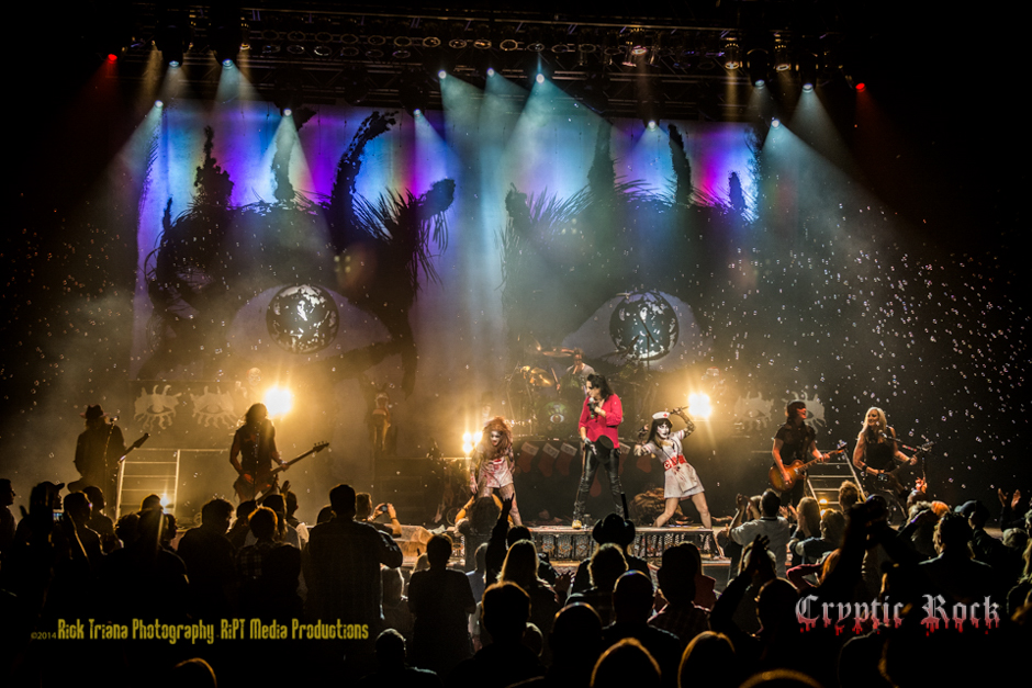 The sound of a thunderstorm overcame the auditorium as Cooper reappeared with his boa constrictor draped around his neck, holding it just so to give the illusion that the snake’s head was coming from his mouth. With an eerie look Cooper said, “Welcome to My Nightmare.” Things got more theatrical from there as he put on his bloody lab coat for “Feed My Frankenstein,” getting strapped to a giant operating table and disappearing in a cloud of smoke from all of the electrical sparks and pyrotechnics going off. Right then the Frankenstein’s monster appeared in a Santa suit keeping the Christmas spirit going. Stimulating for everyone experiencing the show the time came for the man to be put in his straitjacket on for “Ballad of Dwight Fry,” with Sheryl, and Calico Cooper (his daughter), as sadistically dead nurses. As the song built to its conclusion, Cooper yelled, “Don’t touch me!” and started to strangle Sheryl with the sleeves of his straitjacket. Stabbing him, he was subdued and off to the guillotine he went.