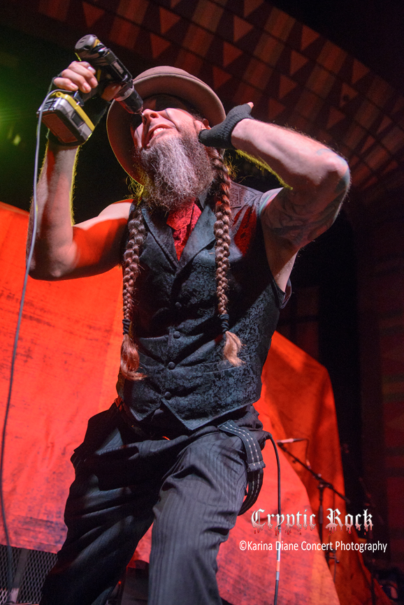 From there it was a very speedy set change from Hellzapoppin Circus Sideshow to the next band, Montréal, Québec’s The Brains. An oddity in the lineup of acts that were all unique in their own right, The Brains is a Rockabilly three-piece act – Rene D la Muerte (guitar/vocals), Colin the Dead (bass/vocals), and Phil The Beast (drums). The only act on The Avatar Country Tour bill without any theatrics involved, despite few sound issues through no fault of their own, The Brains managed to put on a very entertaining show.