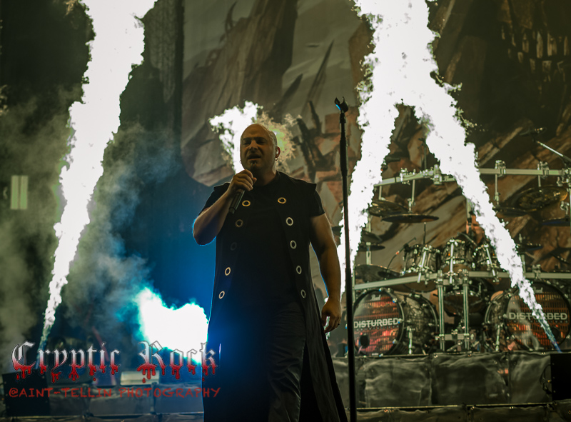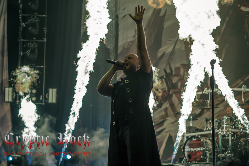 Now, completely shrouded in darkness, Draiman stepped out onto the stage, bathed in red light, and asked to see their fists. Naturally, this ushered in “Ten Thousand Fists,” which saw the crowd pump their fists in the air in response. “The Game” was followed by “The Vengeful One,” which was met with leaping flames from the stage as Draiman stalked the stage in his long, sleeveless coat. Revved up and inspired, “Prayer,” “Liberate,” “Another Way to Die,” and “A Welcome Burden” came before mega hit “Stupify,” where the audience shouted along with Draiman, and yes, fists in the air. Returning to Immortalized, Draiman, now seated, was accompanied by piano, strings, acoustic guitars, and timpani, creating an incredible moment as he performed his rendition of Simon and Garfunkel classic, “The Sound of Silence.” It was met with a sea of lighters and cell phone lights as Draiman captured an emotional moment.