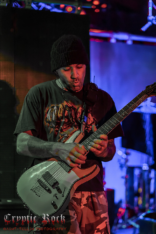 Having too big a lineup to sit comfortably on the platform, Motograterist Dustin “Skunk” Anderson and Percussion/Samplist Joey Vice were stationed on the floor in front of the stage while Drummer Noah “Shark” Robertson (ex-The Browning), Bassist Mylon Guy, Guitarist Jesse Stamper (ex-Dead Horse Trauma), and Vocalist James Legion were on stage. A force to be reckoned with, the septet came out to play their first single from many years ago, “Suffocate.” Still donning the tribal body paint the band was renowned for back on 2003’s Ozzfest, the difference in sound and presence has obviously changed over the years.