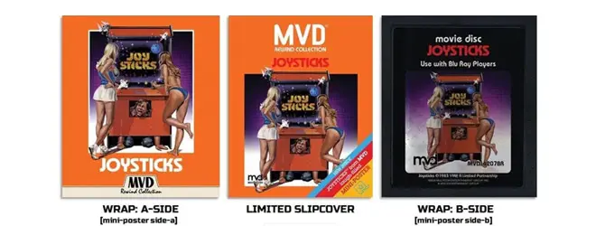 Offered as a 2K scan restoration transfer, and presented in 1080p HD widescreen format, it is apples to apples the same as the Scorpion Releasing limited edition print from 2015. Beyond this, you get an insightful interview with Greydon Clark talking about Joysticks and his other projects, plus some other cool bonus features such as a fan commentary. Relatively simple in terms of supplement material, another big selling point here is a really nice reversible artwork, a 2-sided mini-poster, plus if you get the first pressing, an awesome slipcase. Looking at this for the moment, the slipcase is modeled after a retro Atari cover… so it is really something you may want to try to get your hands on if at all possible.