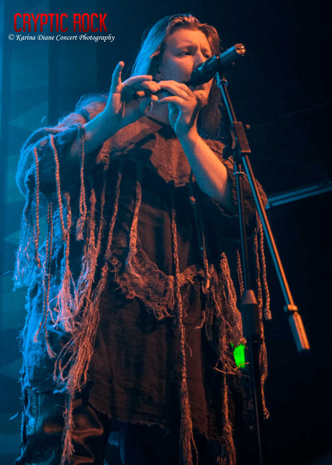 As mentioned, Maria Arkhipova, aka Masha Scream, is the leader of the pack on vocals and keyboards along with Sergei “Lazar” Atrashkevich on guitars, Ruslan “Kniaz” Rosomaherov on bass, Vladimir “Volk” Reshetnikov as the multi-talent on the wind ethnic instruments, along with newest member since 2014, Andrey Ishchenko on drums. Together, they began with an action-packed metaphorical punch full of dominating red stage lighting blaring out their title-track “Krahm” off of their January 2018 album. From there, they stayed current with a few other titles including “Shtorm,” before eventually winding into the other popular classics “Stenka na Stenku,” and “Yarilo.”
