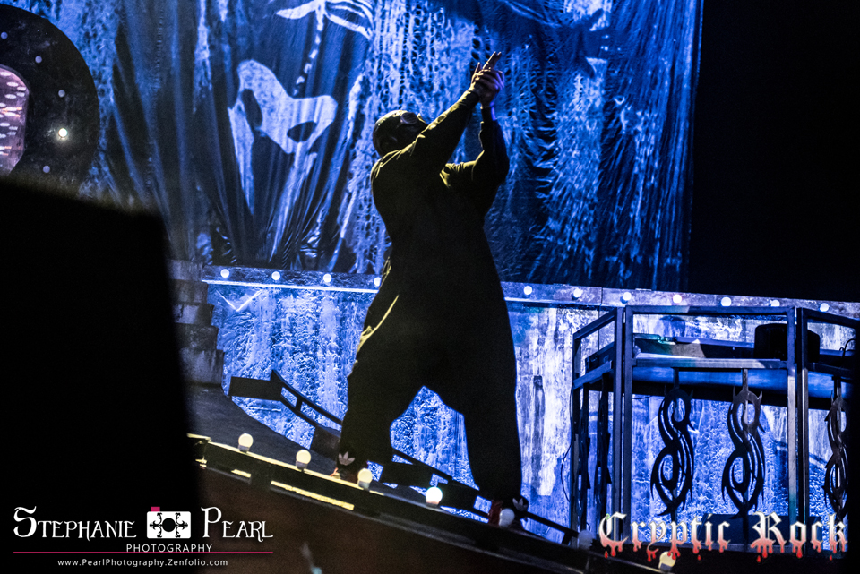 Finally, the time came for Slipknot to appear, and the adrenaline glowing from the audience was boiling over. With slowly spinning drum sets and a huge, white goat head grinning above the stage, the scene was set for a night of debauchery. From the darkness, Taylor started screaming the chorus to “XIX,” encouraging the ecstatic crown to sing along before the band had even made it onto the stage. People were literally bouncing off the walls and each other. A blue light shone down from above as Taylor jumped up onto the riser, throwing his fist in the air. With the melody of “XIX” still playing in the background, Taylor shouted, “Okay, Jersey, let’s fucking do this!” Red lights now swirling with blue, he roared into another new track titled “Sarcastrophe.” The drum kits spun, up, down, and around. Flames shot into the air and the energy was electric as the Des Moines natives played to the crowd.