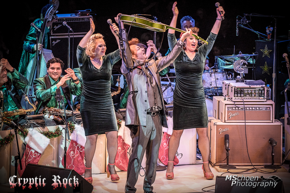 After rocking and rolling for a bit, it was time to take it down just a little. Two microphones and another drum set were brought up on the stage and placed in line with Setzer’s microphone, as the entire horn section left the stage. Just Setzer, The Vixens, Hatton, and McKendree remained on the stage as the song “Jingle Bell Rock” came next. The Vixens share one microphone as Hatton sang the lovely harmonies into the other. After playing most of the song, they stopped and Setzer commented, “Now I know how you Californian’s do it, but here in my hometown, we call it a cappella.” With that said, the song continued with just the vocals and harmonies, which encouraged the audience to join in and sing along with the quartet.