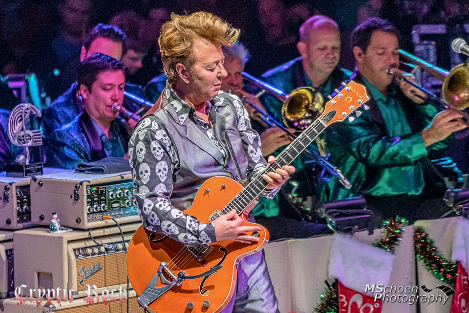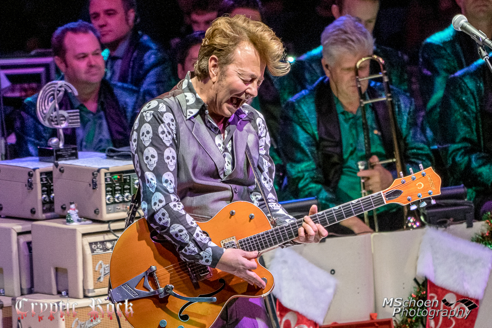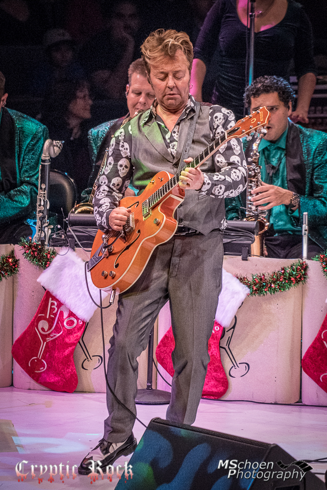 Taking the crowd back to his Rockabilly Stray Cats days, the band kicked into bit hit “Stray Cat Strut,” from 1982’s Built For Speed. As the orchestra really rocked it out, the song included a heavy bass solo by Johnny Hatton and the fans just ate it up. A man yelled out from the audience and held the green guitar above the crowd for Setzer to see, it was one of Setzer’s Signature Series Gretsch Guitars. Taking notice to this man, Setzer invited him to the stage, took it from him and held it up, commenting on how they are guitar twins because at the moment Setzer himself had the same guitar strapped over his shoulder. After handing the guitar back to the fan, they played “Boogie Woogie Santa Claus,” a song that gave a lot of room to showcase the amazing talent accompanying Setzer, as there was a piano solo by Kevin McKendree along with separate Sax, Trumpet, and Trombone solos.