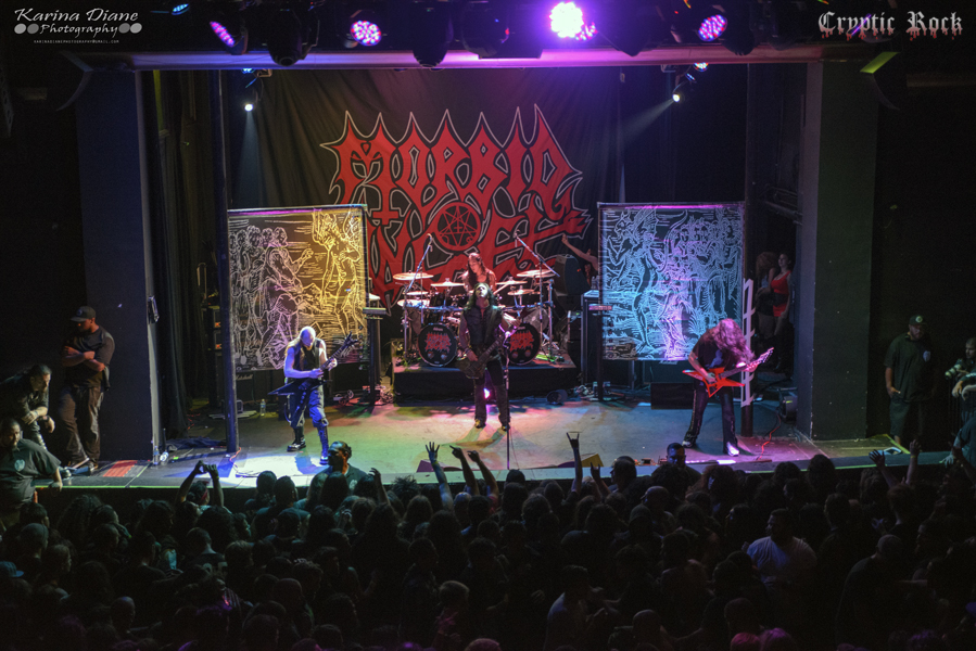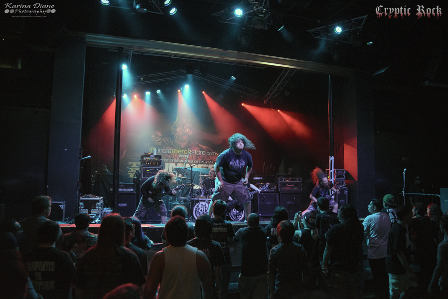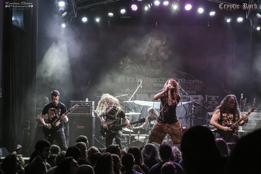Originating back in 2001, The Summer Slaughter Tour became a regular heated thrashing of some of metal’s most extreme bands in 2007. Now partaking in its six consecutive touring year with multiple North American dates, the bill has become a household name on the scene. On a Friday afternoon on July 18th, a large crowd of metalheads gathered at The Observatory in Santa Anna, CA for the second date on a month long tour. With bands such as Morbid Angel, Dying Fetus, The Faceless, Thy Art Is Murder, Goatwhore, Origin, Decrepit Birth, Within the Ruins, Fallujah, and Boreworm, Summer Slaughter promised to be one of the most brutal showcases of metal bands all summer long. With the door opening promptly at 2 PM, the fun began immediately with two platforms featuring the best of Southern California’s bands such as Why We Kill, Voices of Ruin, Nihilitus, None of the Living Remain, Tormentor, and I, of Helix. The local talent brought with them fans, friends, and family of their own to the show; packing The Constellation Room like a sardine can. This was certainly a fitting prelude to the billed bands up next.