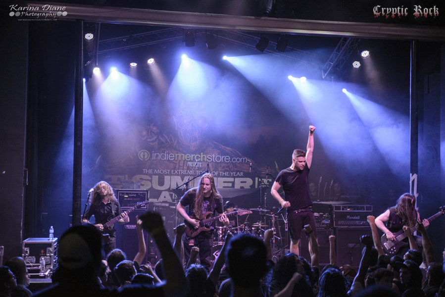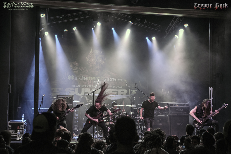 Bringing things back to the technical death metal side with a bit of a progressive route was Los Angeles’ own The Faceless. Returning to The Summer Slaughter for the first time since 2012, the band formed in 2003 in Encino, CA has grown immensely in popularity over the course of three studio albums. Sustaining lineup changes in the past couple of years, lead guitarist/clean vocalist Michael Keene remains the only original member in the band as they continue to triumph on with bassist Evan Brewer, vocalist Geoffrey Ficco, drummer Alex Rüdinger, and newest member guitarist Nico Santora. Combining spot on vocals and guitars, the audience was in awe of the atmospheric performance as they played songs from their 2012 album Autotheism. Ficco moved around the stage to the groove of each tune and The Faceless dominated in their time which ceased with the track “Xenochrist”.