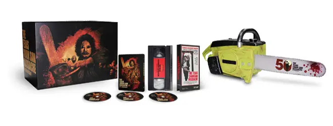 Breaking it down, the set truthfully has a lot to offer; from the aesthetic appearance as a conversational piece, you can display, to the internal content of the packaging. Offered up in a lovely box with 50th-anniversary artwork dressing on each side, inside you get a plastic construction chainsaw with a faux blade that also dons the 50th-anniversary logo. From here, you learn that this chainsaw actually houses a 50th anniversary 3-disc 4K UHD edition of The Texas Chain Saw Massacre, but also a nostalgic VHS copy with vintage art!