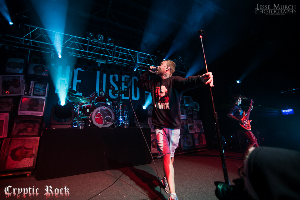 As the lights blacked out and the crowd roared, it came to the point for headliners The Used. Arriving on stage like banshees out of hell, Jepha Howard, Quinn Allman and Dan Whitesides, lead by the charismatic vocalist Bert McCracken, ignited a reaction with 2002 track “Maybe Memories.” Gladly accepting the throwback with open arms, the audience moved all over the floor while screaming every lyric out-loud. Continuing to take their fans through a quick history lesson, they moved into “Take it Away”and then onto the 2007 album Lies For the Liars with “The Bird and the Worm.” Bouncing about the stage with an energy few frontman can match, McCracken and his bandmates moved into a balanced attack of “Listening,” before “Cry,” and “I Caught Fire.”
