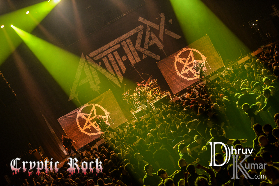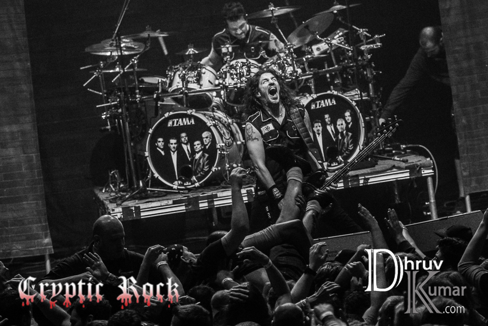 As the intro of “Worship” filled the air, the band took the stage as fans screamed in delight. Opening with their classic and favorable track, “Caught in a Mosh,” from the 1987 album Among the Living, rung out the energy in Belladonna who ran across the stage and interacted with the crowd. The thrill continued with the Joe Jackson cover of “Got The Time” from their fifth studio album released back in 1990, Persistence of Time. Ian’s rhythm remained on point as he electrified the room while newest member Donais showed his capabilities, owning his axe in the classic “Madhouse” from 1985’s Spreading the Disease. Belladonna honed the mic with his exemplary scream, bringing the entire crowd to raise their fist and sing along with the infamous “I Am the Law.” The stamina magnified during their latest “Fight ‘Em ‘Til You Can’t,” which Bello and Donais had a headbang duel as they conquered the bass and axe. Next up was a song that is known as “Soror Irrumator” from the Catch of Thrones Vol.2 part of the Metal Masters pack, in celebration of the HBO hit series, Game of Thrones, however, Belladonna introduced it as a new track for their upcoming album entitled “Sister F&*%er.” Benante’s harsh thuds vibrated throughout the room, rendering all mesmerized.
