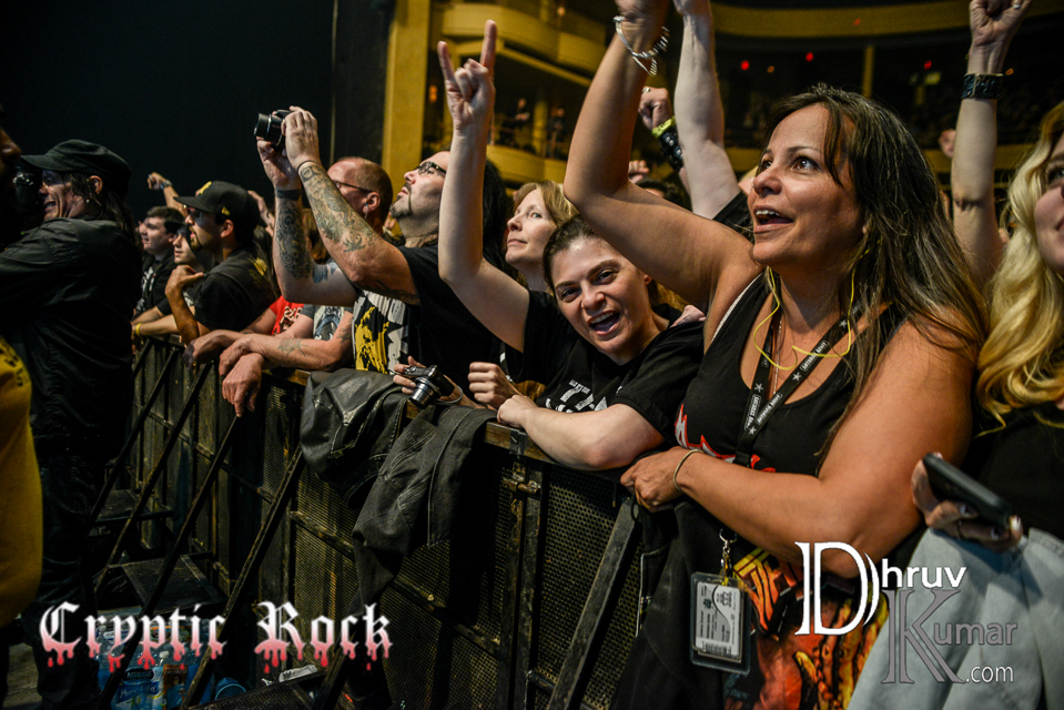 The room went quiet when Poulsen looked into the sea of people, expressing how much he wanted to see everyone in the room crowd-surf and then went right into “The Mirror and the Ripper.” One fan took his statement to heart and climbed up the balcony to jump into the crowd for his Metal surfing capabilities. Slowing down, ever so slightly, “The Hangman’s Body Count” evaporated into a guitar duel between Poulsen and Caggiano. Before leaving the stage, Poulsen made dreams come true, asking all of the children who were in the audience to walk onto the stage during “16 Dollars.” During this performance, Kjølholm and Caggiano were playing directly in front of them as they all head-banged along. Halfway through, in a playful manner, Poulsen halted it in order to give a kid a Rocker haircut on stage. A magical moment for the youth of Rock, everyone, including the kids who were reluctant to leave their spot, walked off of the stage.
