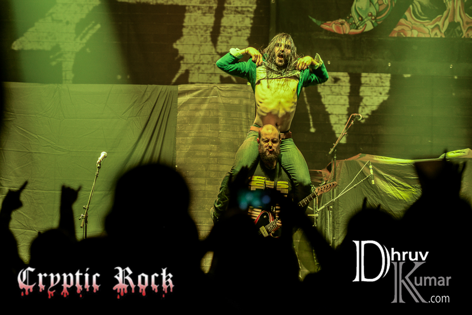 Switching gears, Poulsen reminded all of one of his biggest influences in Rock-n-Roll, Johnny Cash, as they performed an excerpt of “Ring of Fire.” Listening to his fans singing along with him, Poulsen joked by expressing that they all sounded like Lemmy from Motörhead. After the fans caught their breath from laughter, Poulsen continued with “Sad Man’s Tongue” and admitted that he borrowed it from Johnny Cash. Moving right into the amplified sound of “Guitar Gangsters & Cadillac Blood,” the crowd sparked once again with Volbeat’s vibrating energy. To the surprise of all, making a trip in from New Jersey, was Jerry Only from the Horror Punk legendary The Misfits joining the band on stage as they jammed through “Angelfuck.” Thereafter, Poulsen continued to wow Hammerstein Ballroom while he crowd surfed into the audience to hand a seven-year-old child a T-shirt during “The Garden’s Tale,” where shortly after, Poulsen jokingly stated to the kid’s father that he owes him ten bucks. Continuing to flow through the music effortlessly, headbanging cuts “Heaven Nor Hell” and “Warrior’s Call” erupted before “Doc Holiday,” where Caggiano moved in with another vigorous guitar solo.